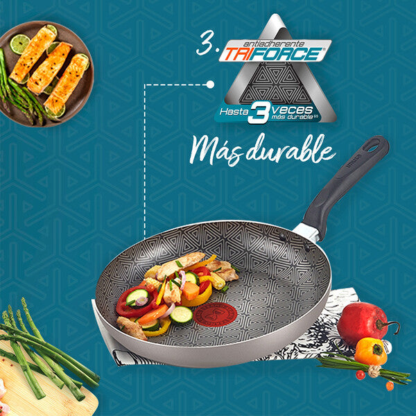 Su antiadherente Triforce Gold es 5 veces más resistente Comparado con otros antiadherentes de nuestra marca. Con termo señal que indica el momento perfecto para comenzar la preparación de tus alimentos. Base difusora para una distribución homogénea del calor. Mangos ergonómicos con elegante inserto metálico para un mejor agarre. Sus tapas de vidrio con válvula de salida de vapor cubren de salpicaduras y permite visualizar cómo van tus preparaciones.