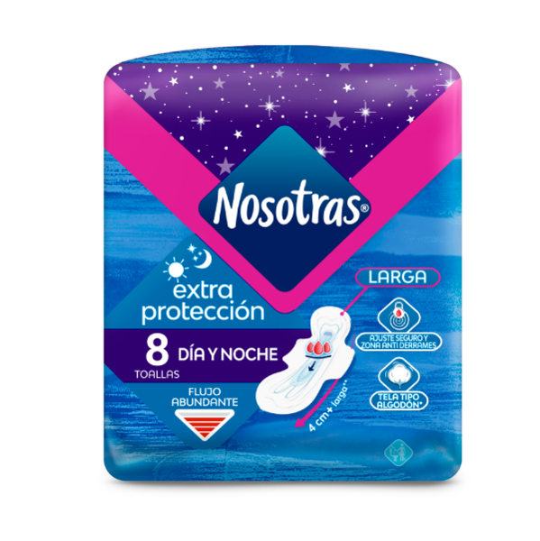 Cuando estás ocupada o tienes flujo más abundante, una extra protección puede hacerte sentir más segura. Con Nuestras Toallas Nosotras® largas con tela tipo algodón no tienes de qué preocuparte, ya que absorben el flujo y te mantienen limpia y seca, de día o mientras duermes.